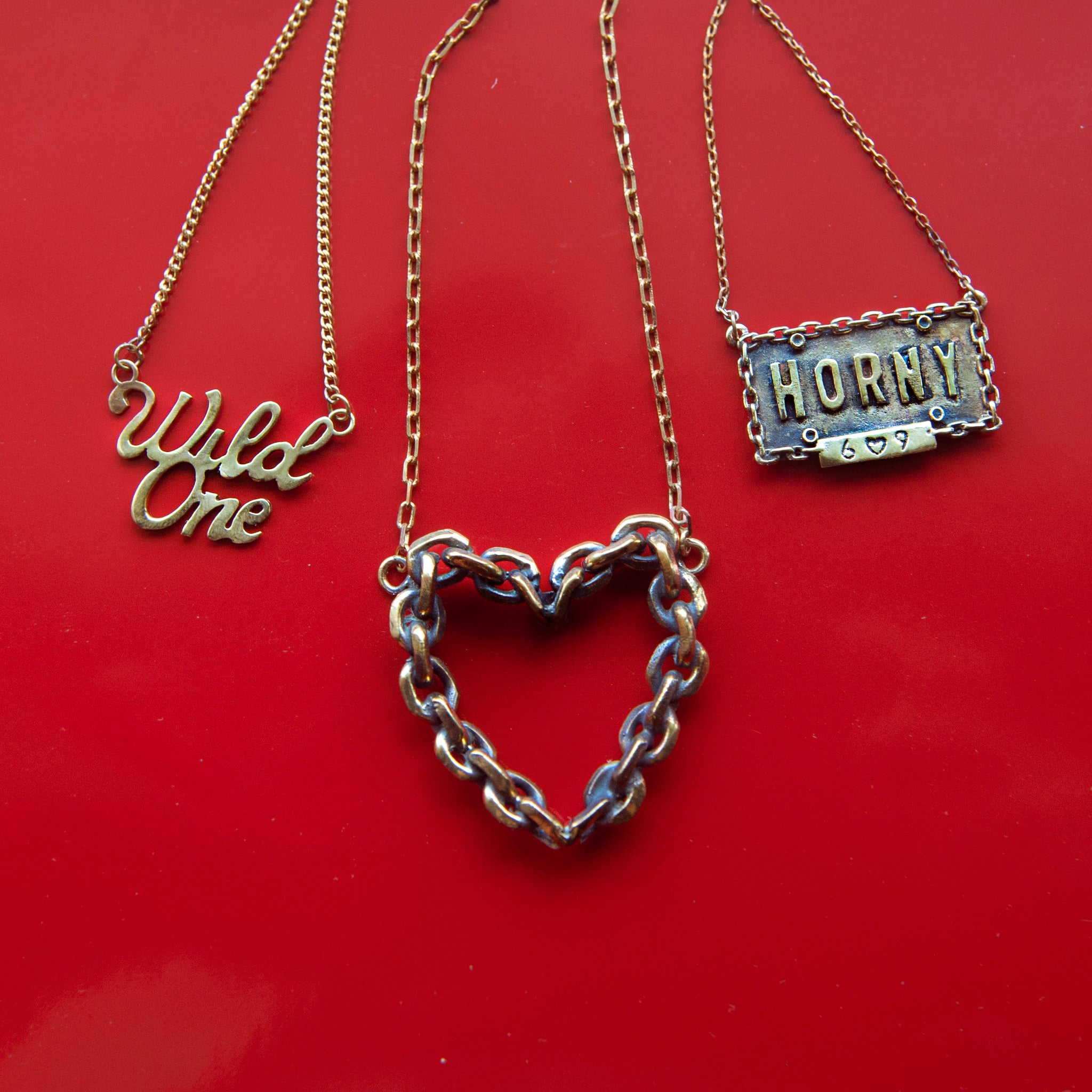 Available in brass or sterling silver. Chain is approximately 16" around and pendant approx. 1" x 1/2" If you need a specific length shoot me an email. I can adjust additional length for a fee on the sterling & gold, free of charge on brass. In the photos with set of three there is brass on the left, 14k gold center, & silver on the right